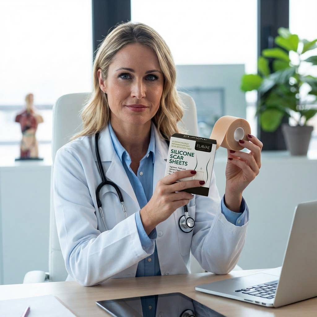 "For my patients with C-section, surgical, or injury scars, I often recommend high-quality options like Elavara's Silicone Scar Sheets. It's crucial to use 100% medical-grade silicone for both safety and efficacy. I specifically mention Elavara because they guarantee this quality, and it's important to watch out for counterfeit products sold online that may not be effective.”